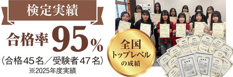 全国1,637名が受験した検定の合格点数において、本校学生が全国1位をはじめ、2位に2名、5位に1名と、ベスト10以内に4名がランクイン。さらにベスト20位以内には9名が入る結果となった。検定を主宰する一般社団法人日本ホテル教育センターからは、2年連続で「優秀指導校賞」を受賞。全国でもトップクラスの教育力が、高く評価されています。